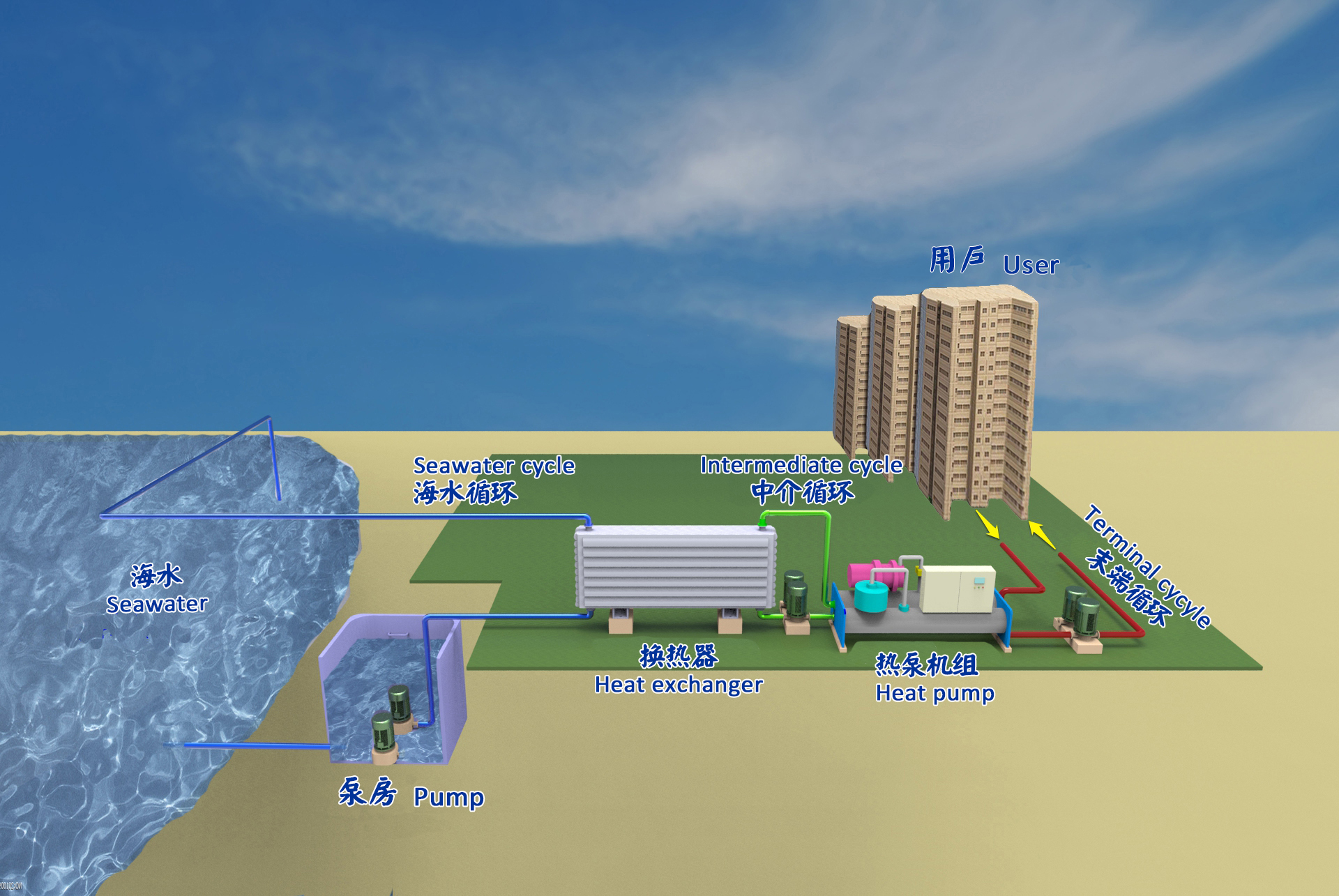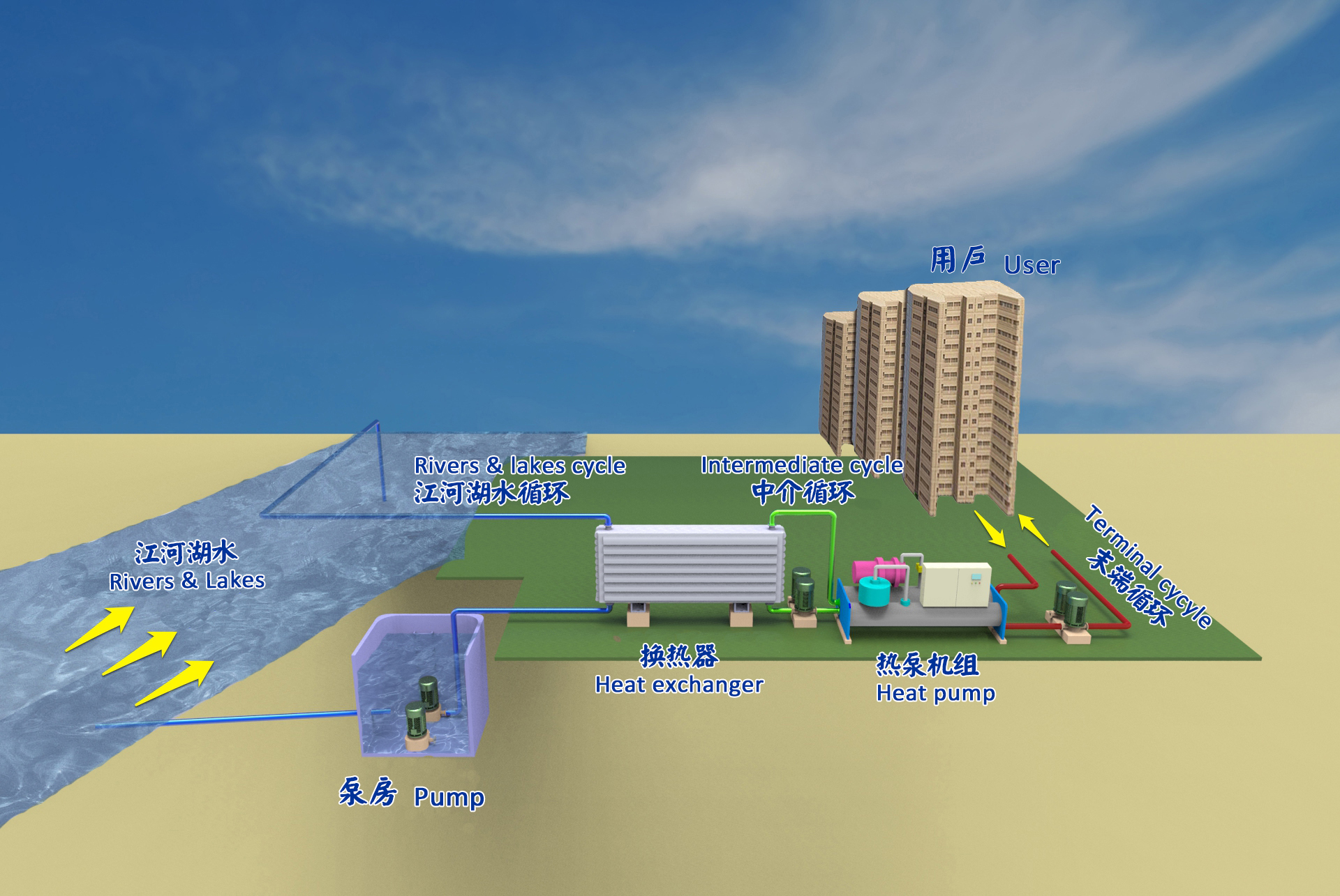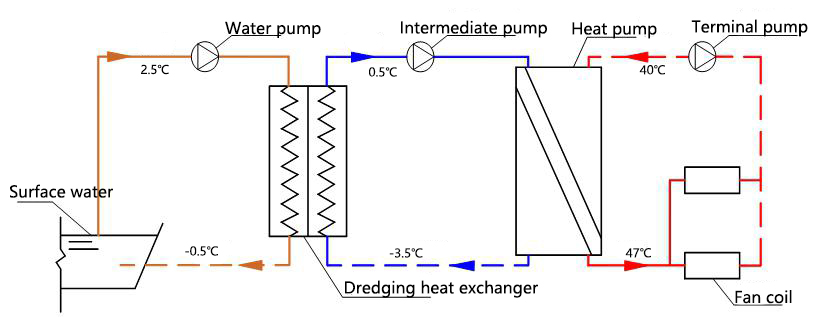 The surface water source heat pump system is composed of three sub cycle systems, namely the surface water circulation, the intermediate circulation and the terminal circulation. The main equipment of the system includes surface water pump, dredging type heat exchanger, terminal water circulation pump, heat pump unit and terminal circulating pump.