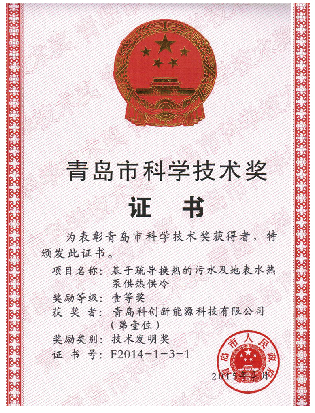 2014年度市科學(xué)技術(shù)獎勵評審工作已經(jīng)結(jié)束,我公司吳榮華教授領(lǐng)銜團(tuán)隊開發(fā)的成果“基于疏導(dǎo)換熱的污水及地表水源熱泵供熱供冷”被授予技術(shù)發(fā)明獎一等獎,本次獲得該項科技獎表明我們的研發(fā)成果得到了專業(yè)部門及政府的極大肯定,也極大的堅定了我們把科技創(chuàng)新放在企業(yè)發(fā)展首位的理念。