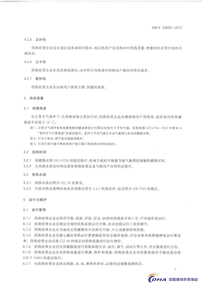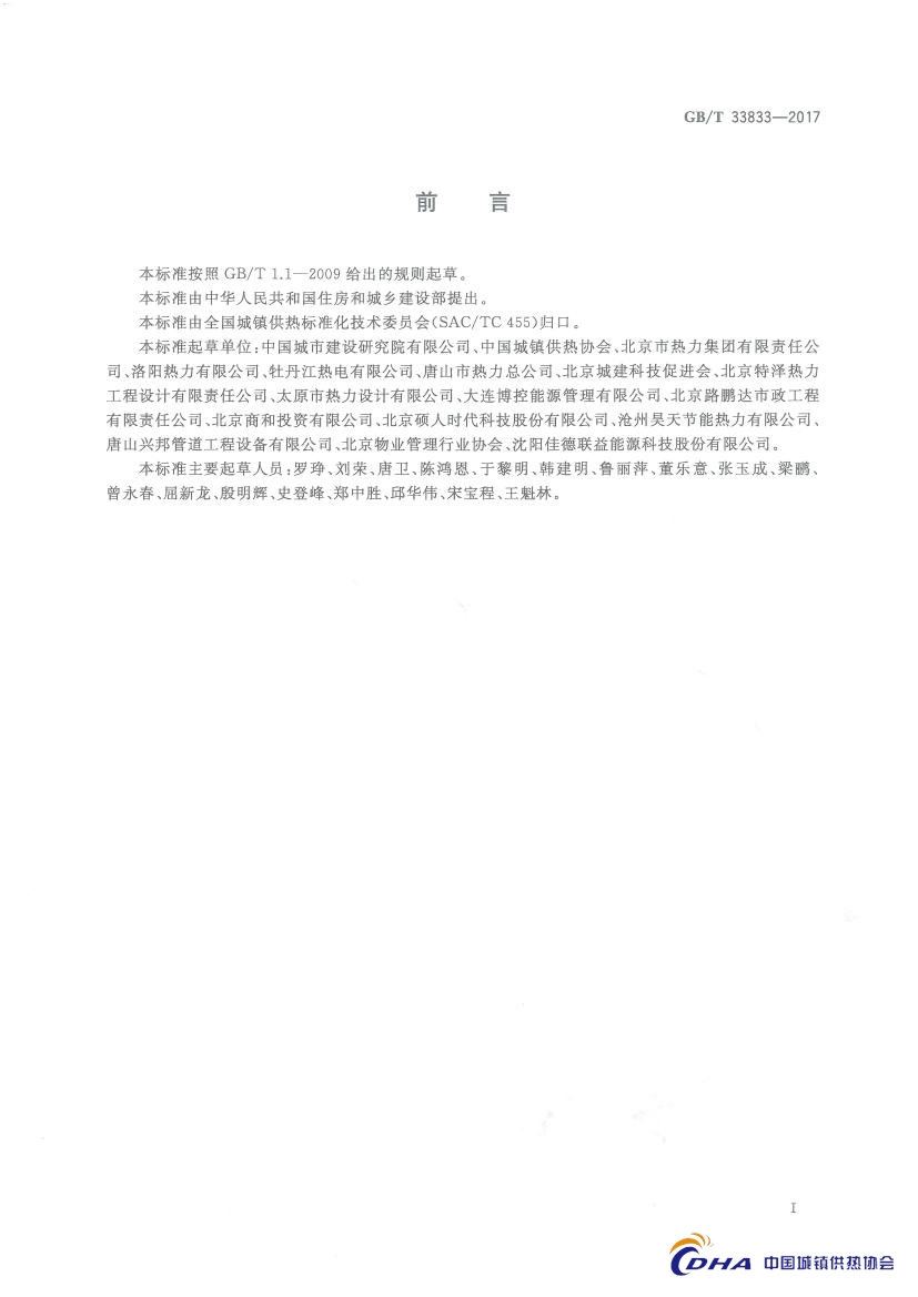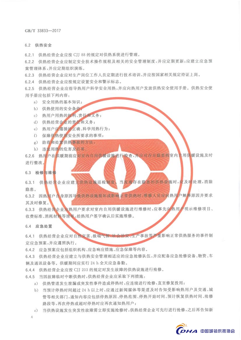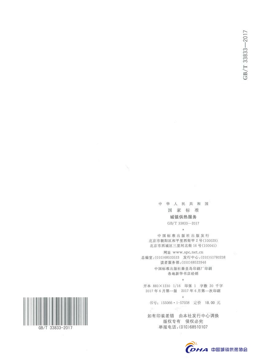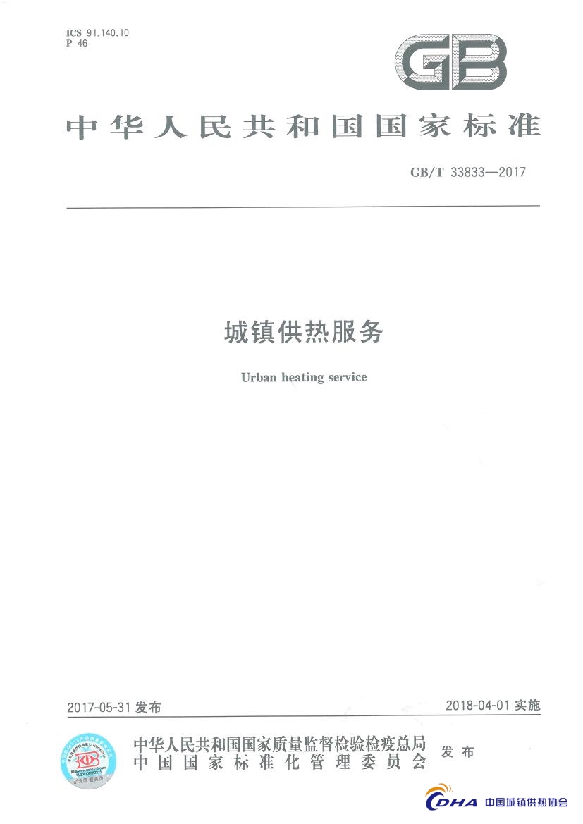 由中國(guó)城市建設(shè)研究院有限公司、中國(guó)城鎮(zhèn)供熱協(xié)會(huì)、北京市熱力集團(tuán)有限責(zé)任公司為主要起草單位編寫(xiě)的《GB/T 33833-2017 城鎮(zhèn)供熱服務(wù)》國(guó)家標(biāo)準(zhǔn)于2017年5月31日由中華人民共和國(guó)國(guó)家質(zhì)量監(jiān)督檢驗(yàn)檢疫總局和中國(guó)國(guó)家標(biāo)準(zhǔn)化管理委員會(huì)聯(lián)合發(fā)布發(fā)布,于2018年4月1日起實(shí)施。