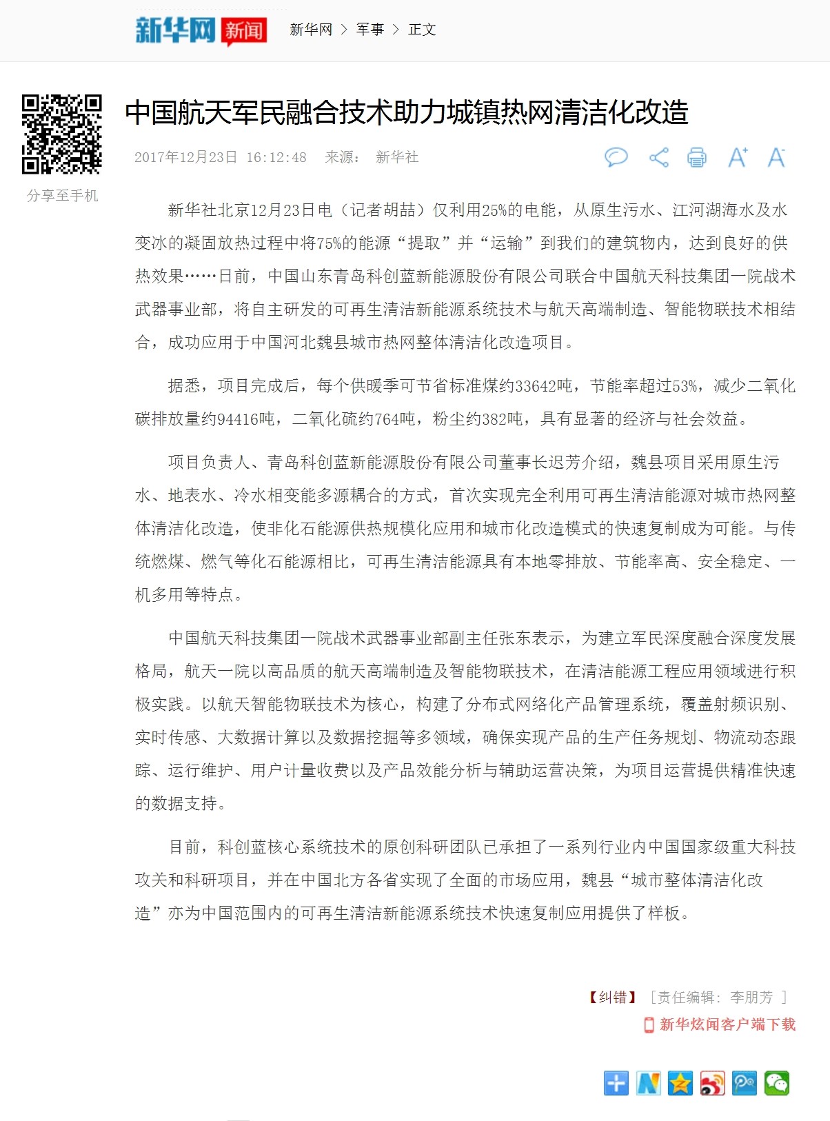 中國航天軍民融合技術(shù)助力城鎮(zhèn)熱網(wǎng)清潔化改造